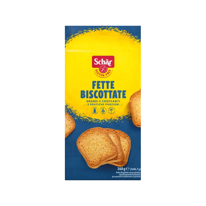 fette biscottate senza glutine, senza lattosio, ricche di fibre, particolarmente formulate per intolleranti al glutine